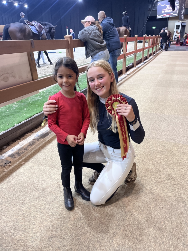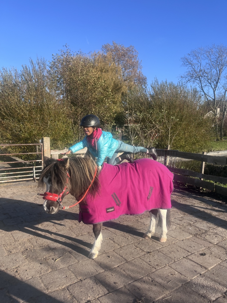 Ook haar pony’s Skittles en Whitestar horen bij haar team. Later wil ze heel goed leren voltigeren én net zo goed kunnen springen als haar grote voorbeelden.