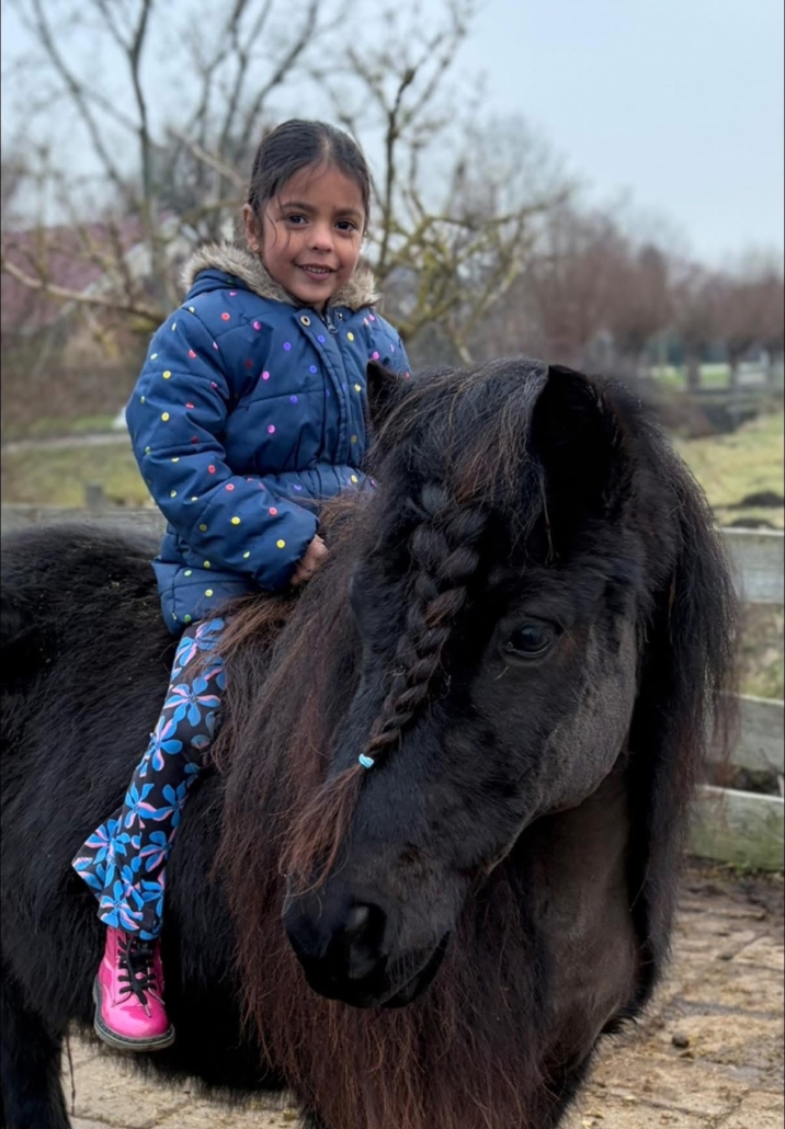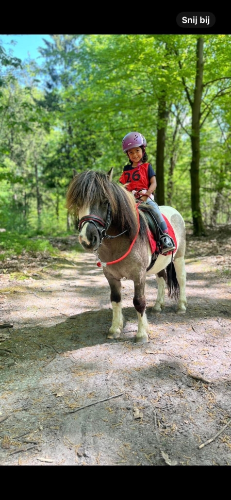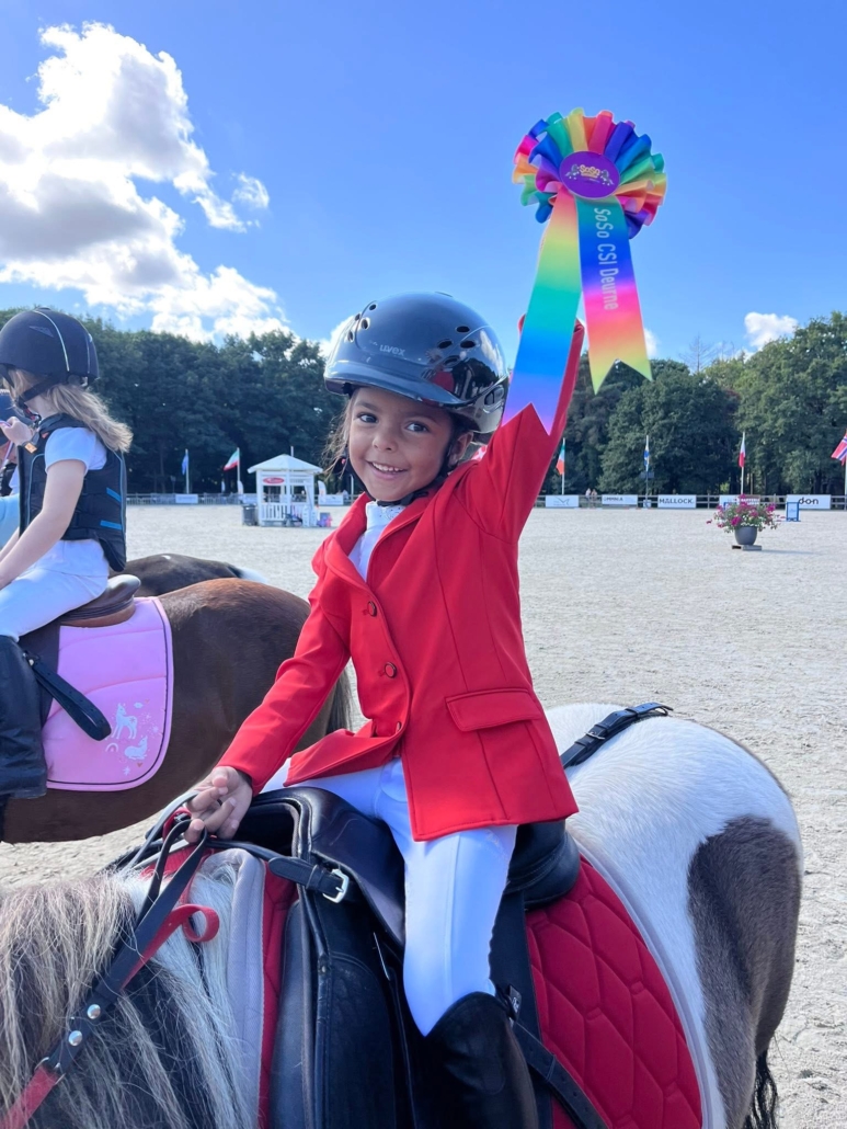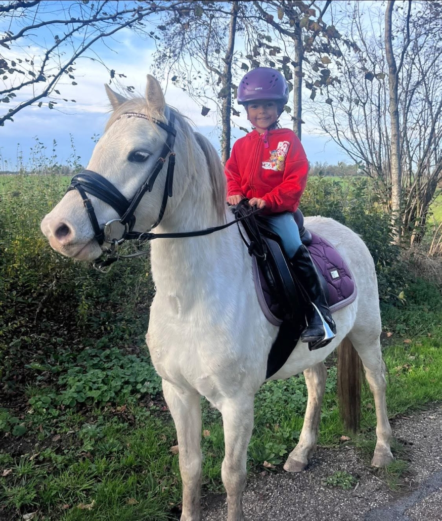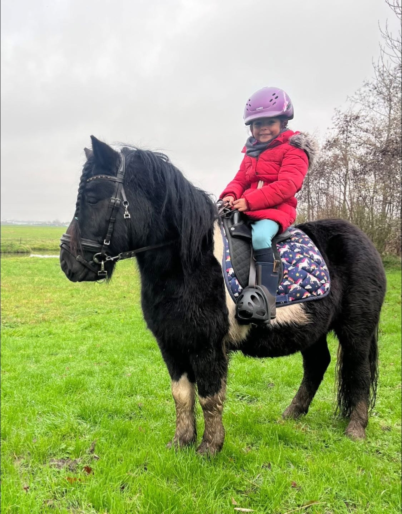 Celena van Trigt is 6 jaar en zit al op een pony sinds ze heel klein is. Haar allerliefste pony is Speedy, een 12-jarige shetlander. Samen rijden ze graag buiten en doen ze mee aan Bixie-wedstrijden. Celena vindt het leuk om verschillende disciplines te proberen, zoals voltige, dressuur en springen.